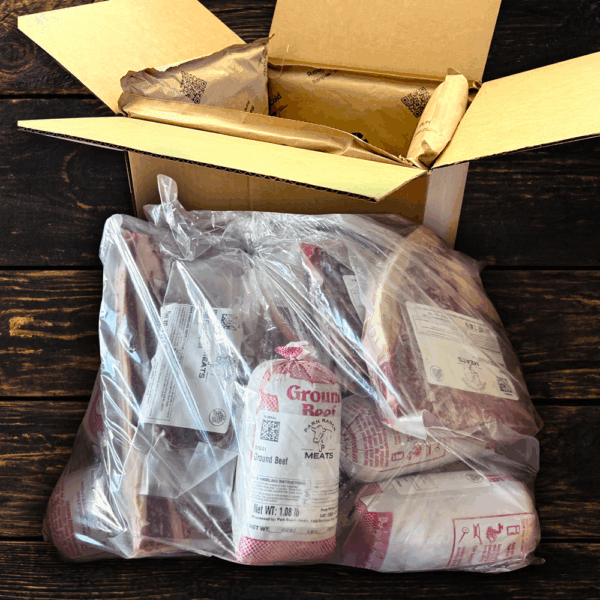 - Split evenly between steaks, roasts, and burgers but can be customized – message us!